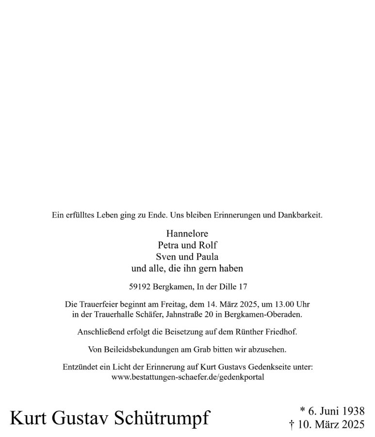Kurt Schütrumpf war ein Mann mit einem großen Herzen. Er liebte die Natur und wusste sehr viel über sie zu erzählen. So wird er mir in Erinnerung bleiben und ich bin sicher, dass viele andere besondere Erinnerungen an ihn erhalten bleiben. So ist sein Körper gegangen, aber seine Seele bleibt mit euch Allen verbunden.