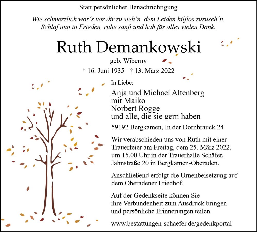 Frau Ruth Demankowskigestorben am 13. März 2022